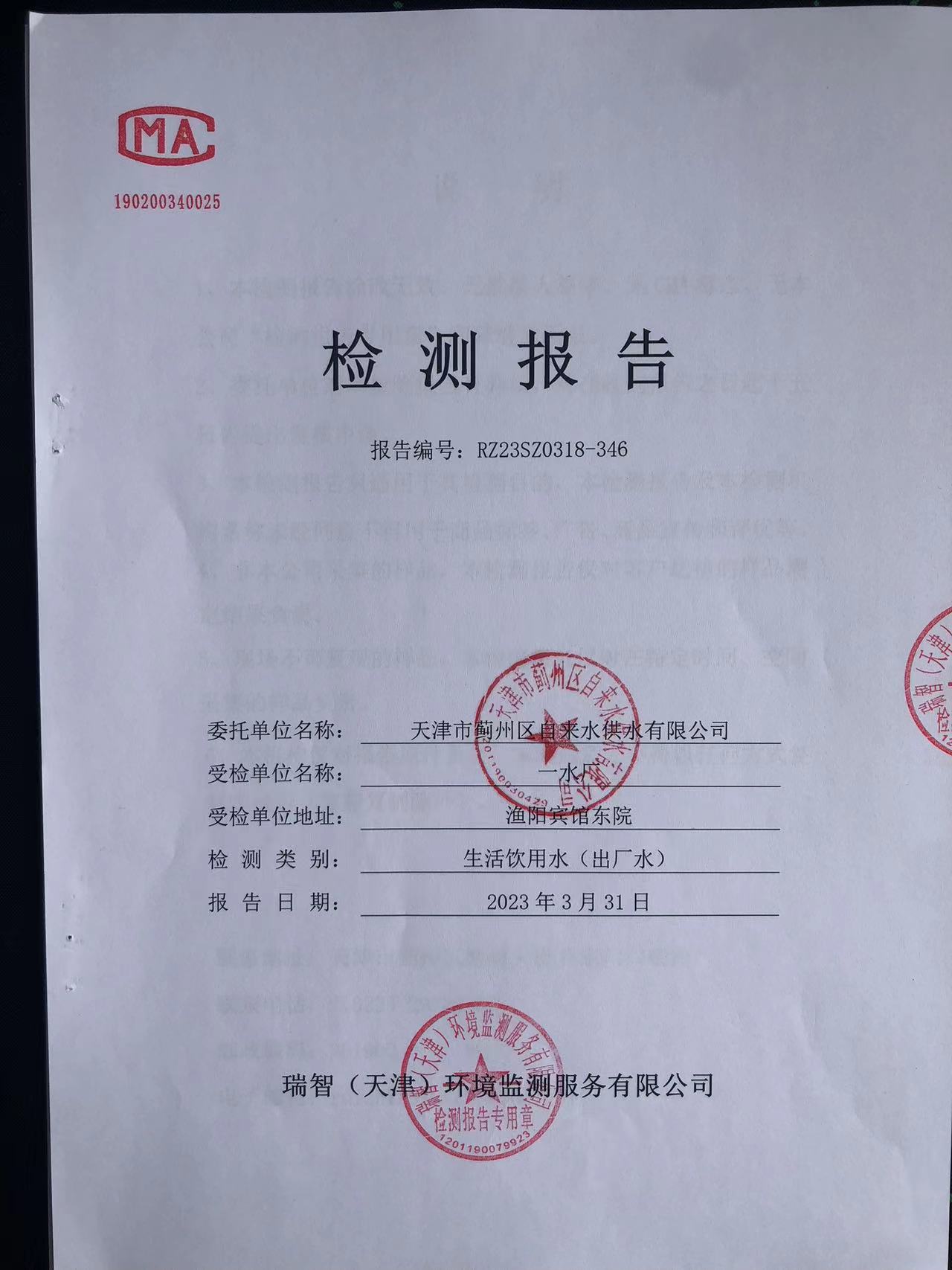 2023年3月份水質(zhì)檢測報告