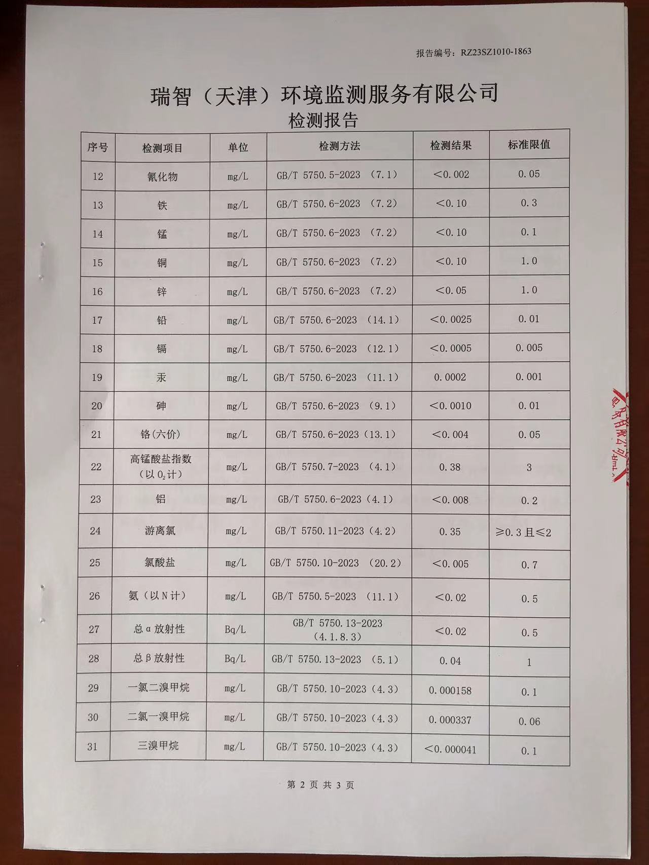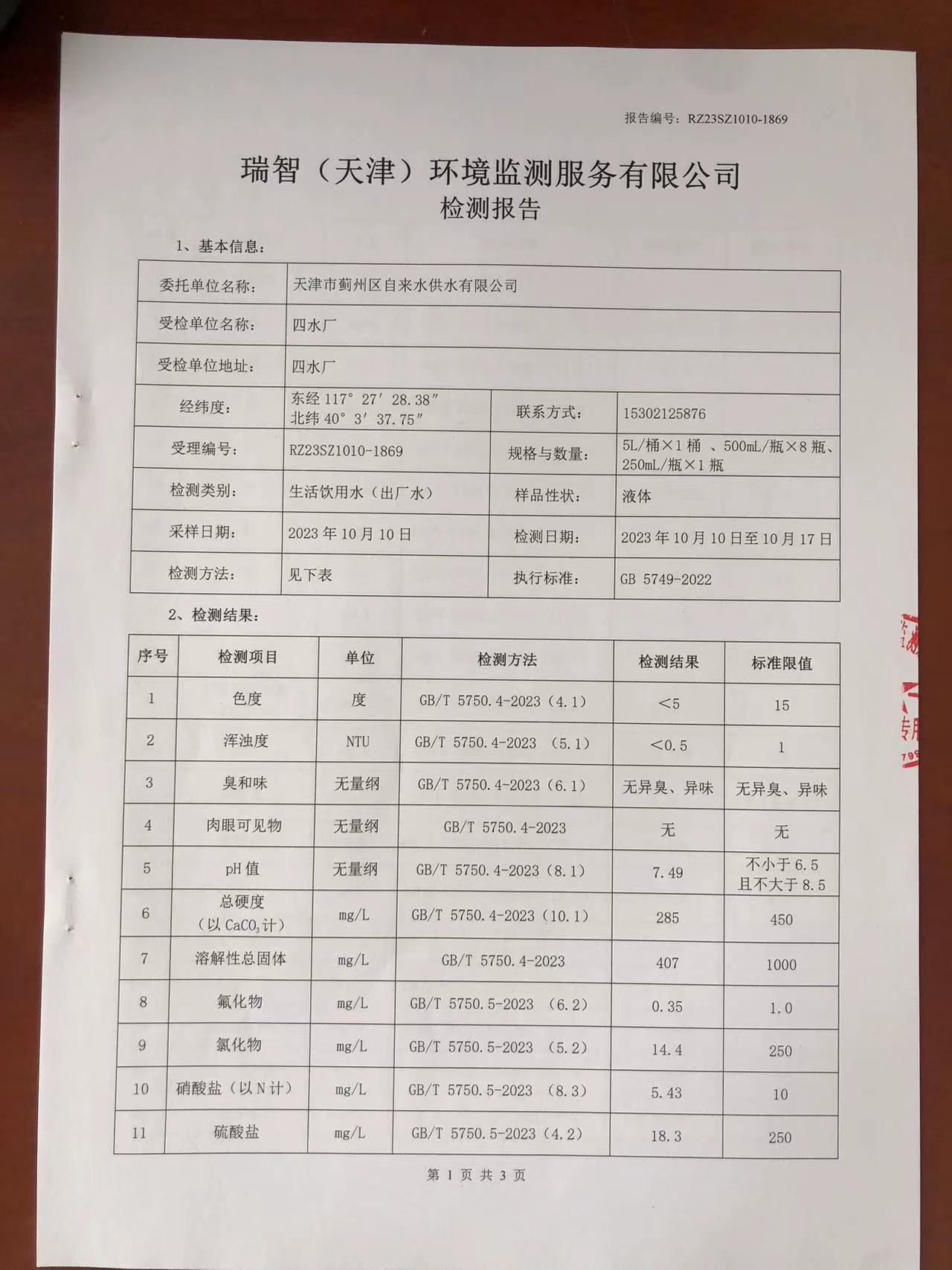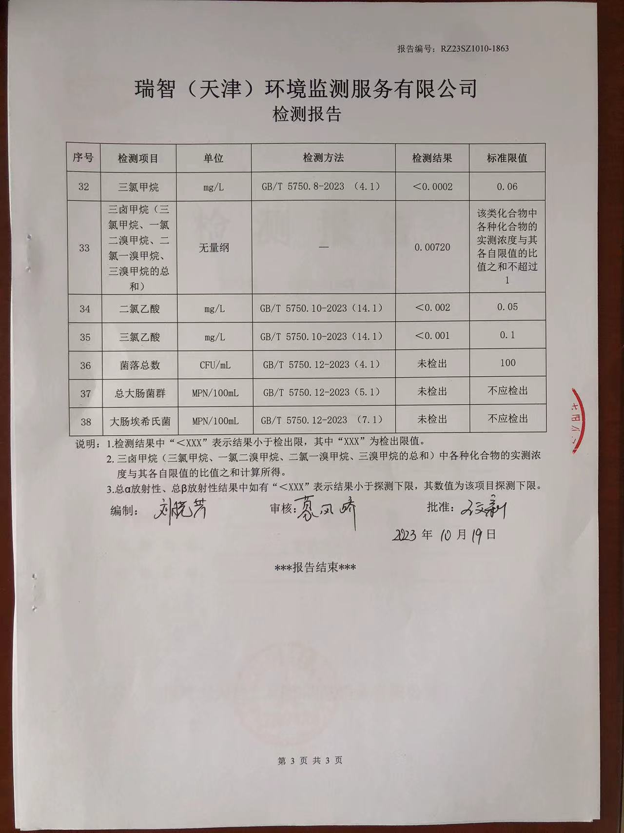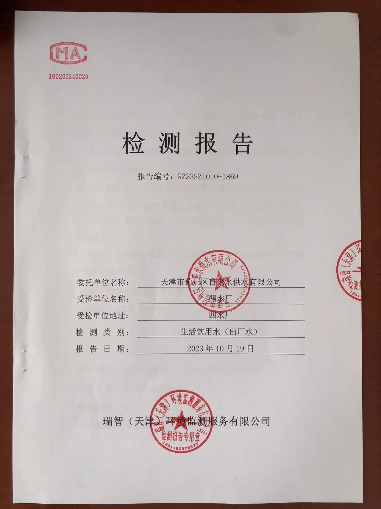 2023年10月份水質(zhì)檢測報告