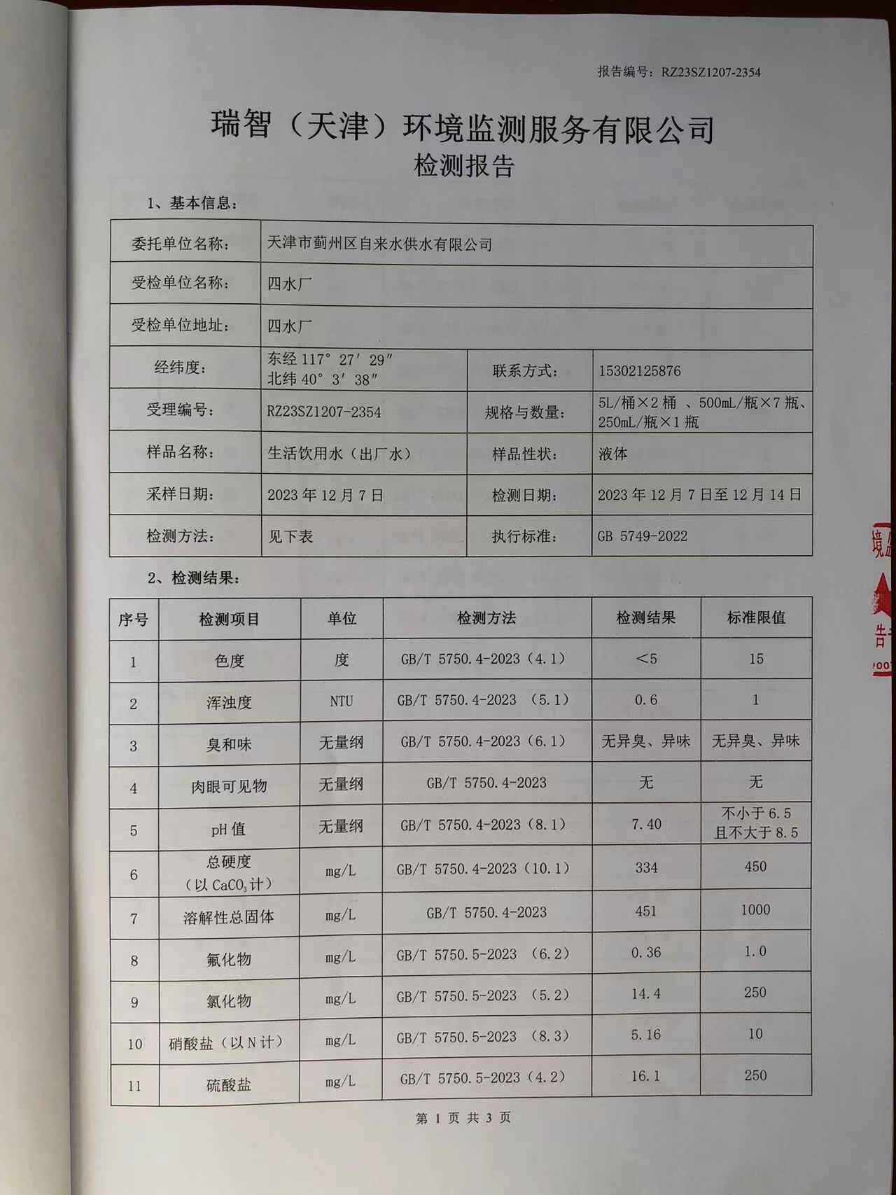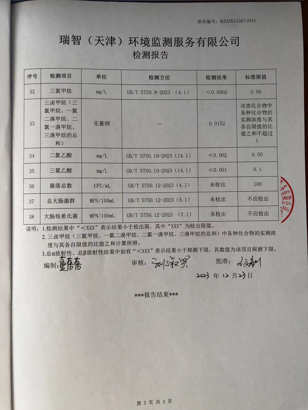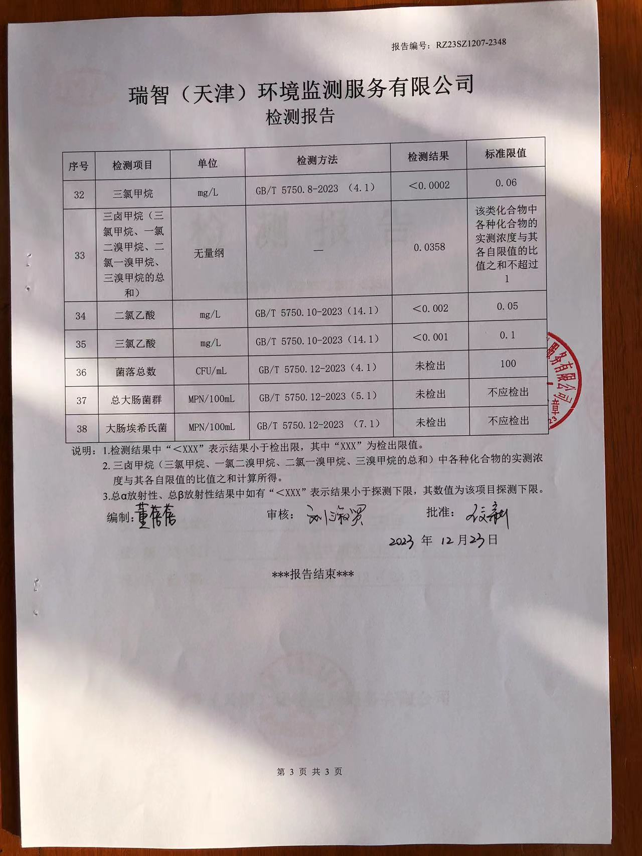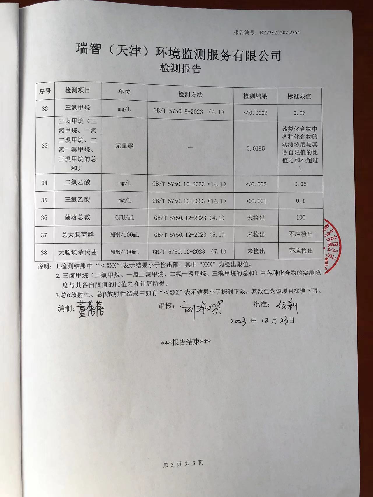 2023年12月份水質(zhì)檢測報告