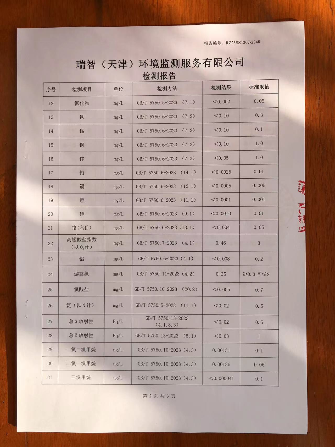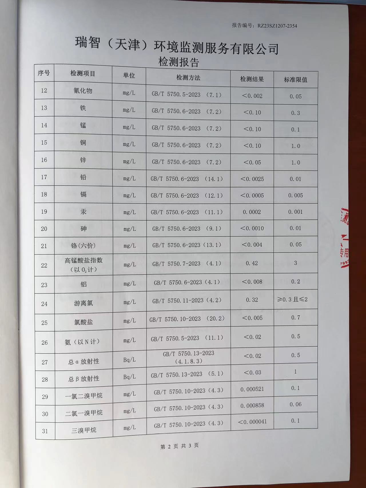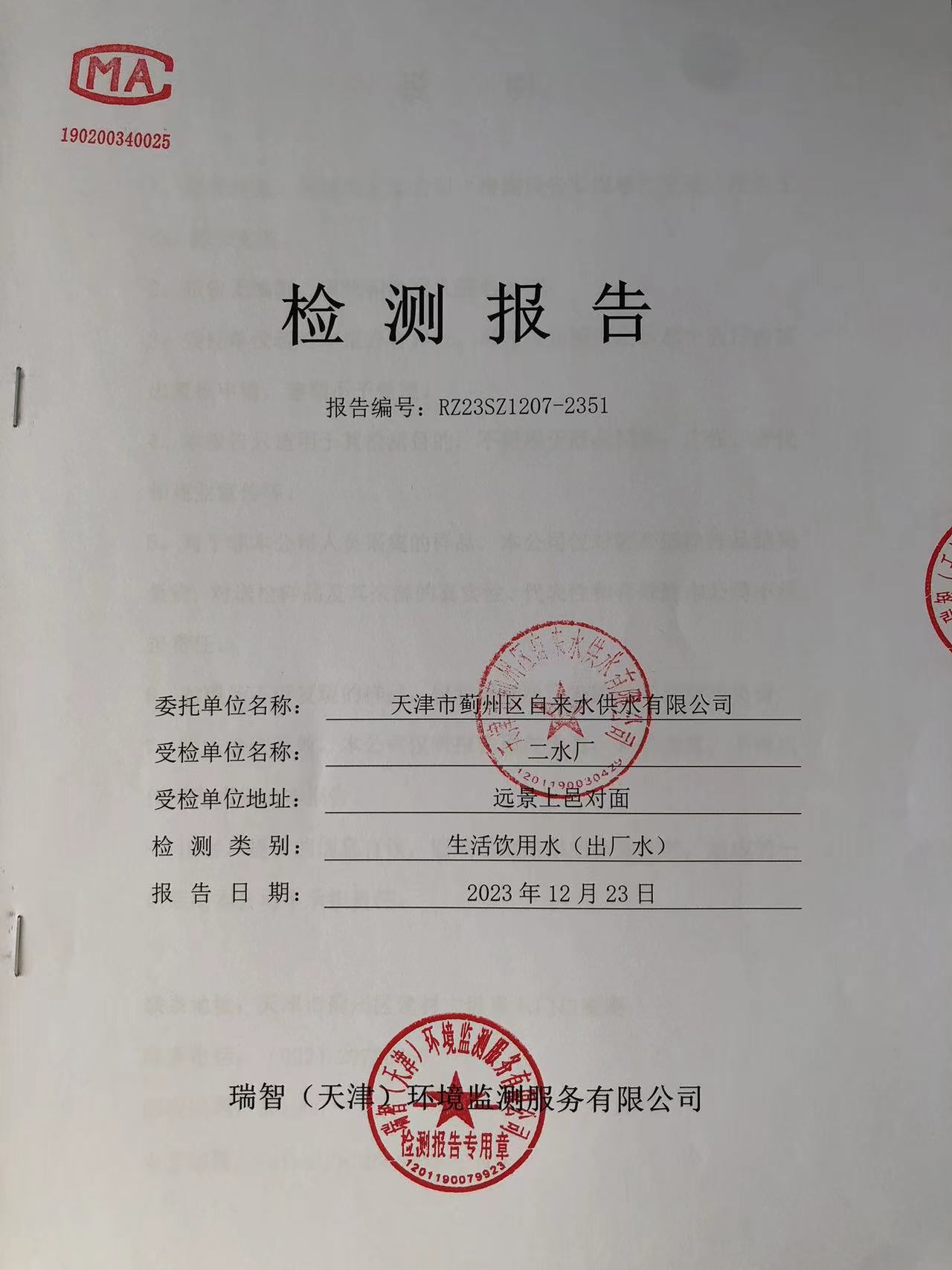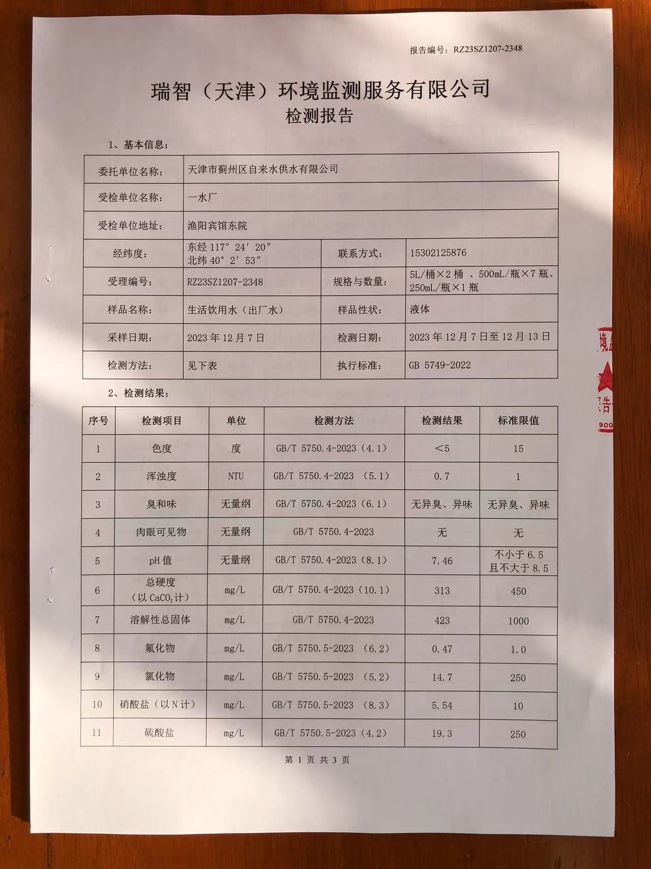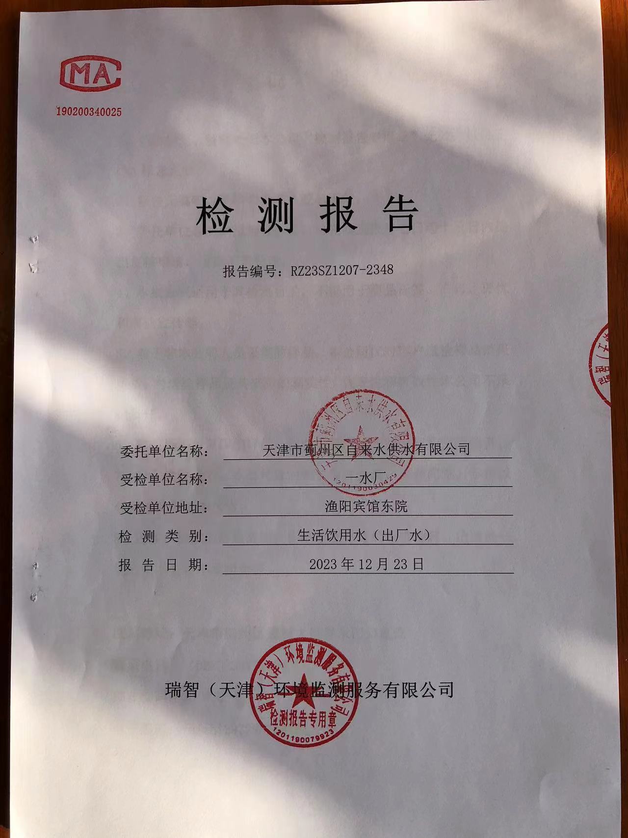 2023年12月份水質(zhì)檢測報告
