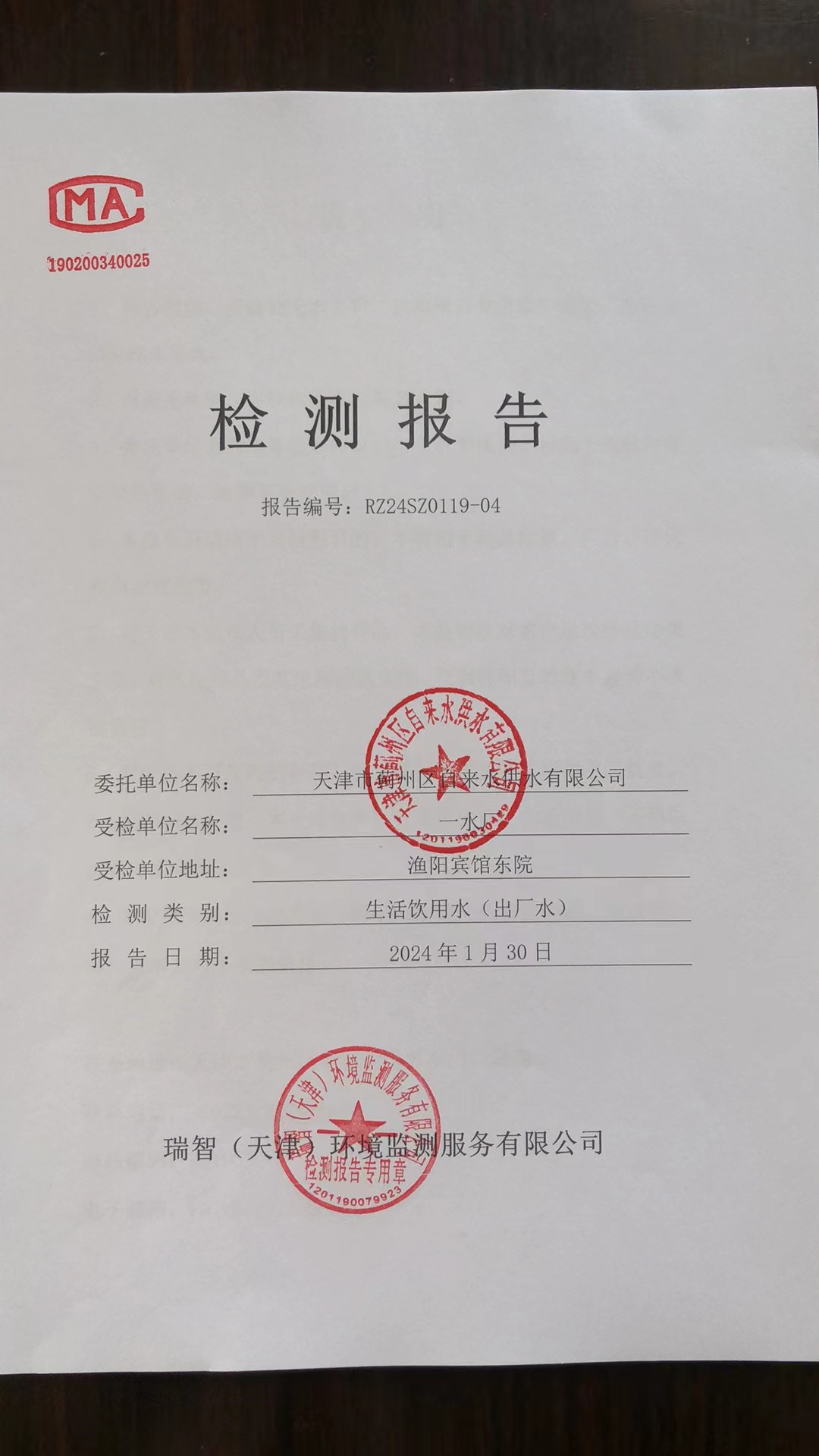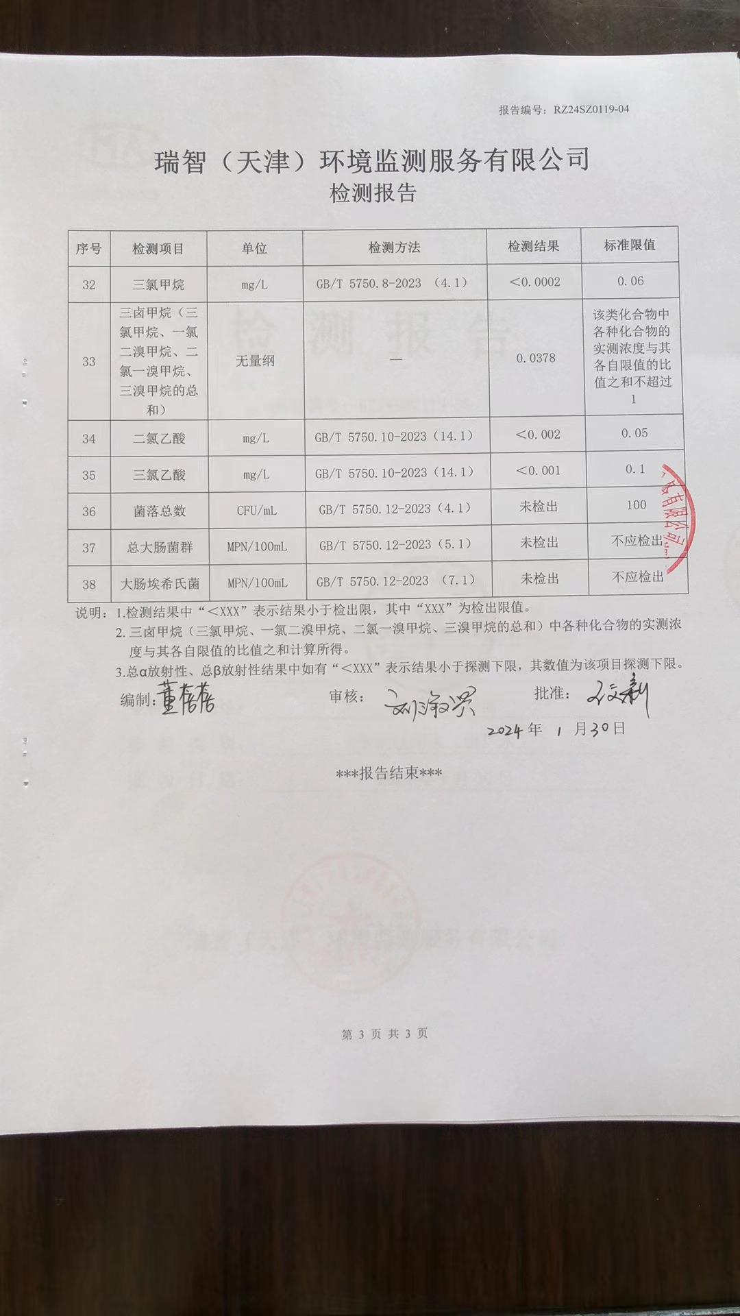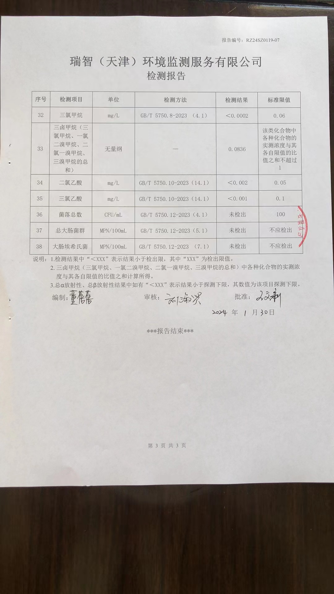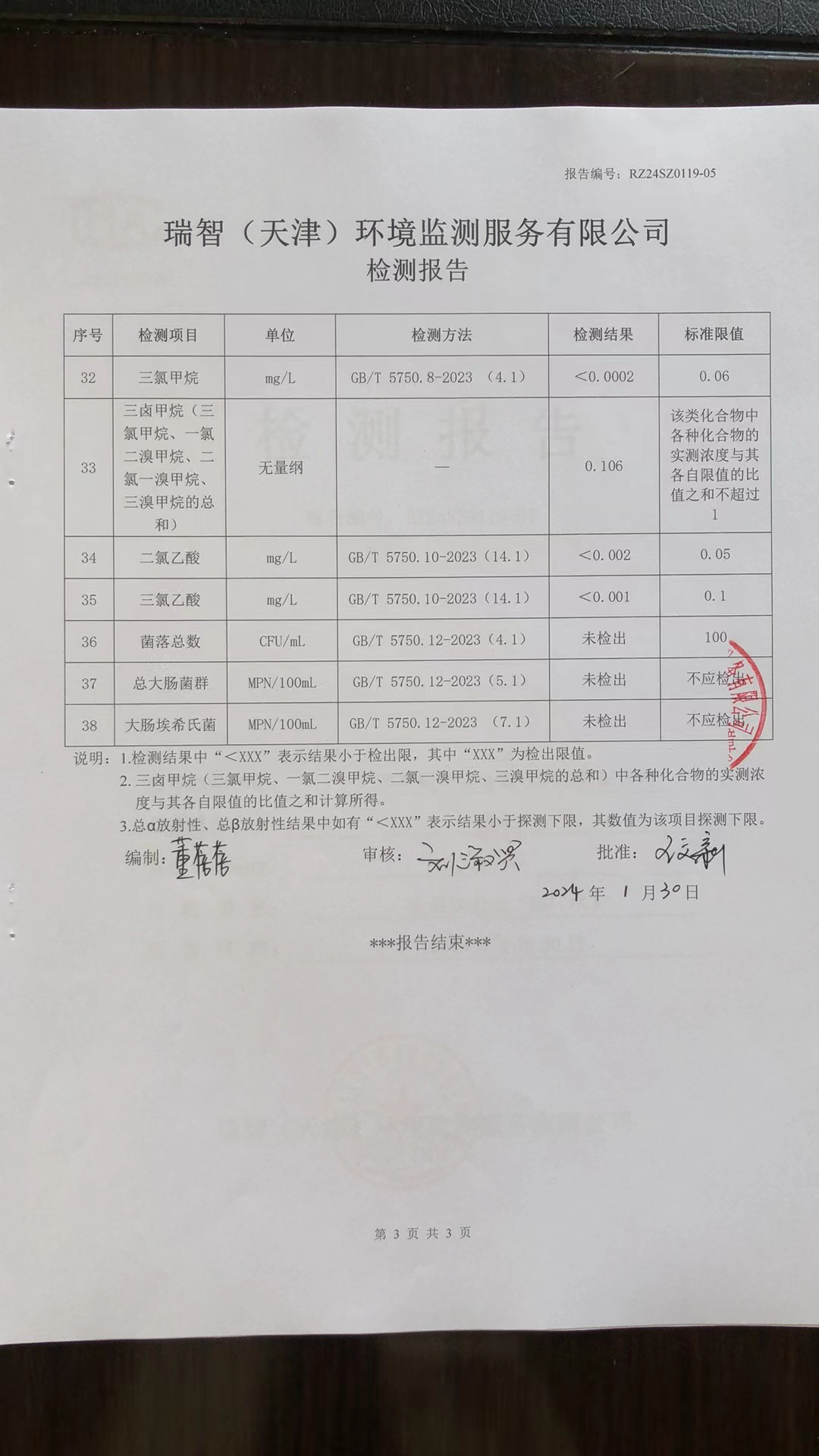 2024年1月份水質(zhì)檢測報(bào)告