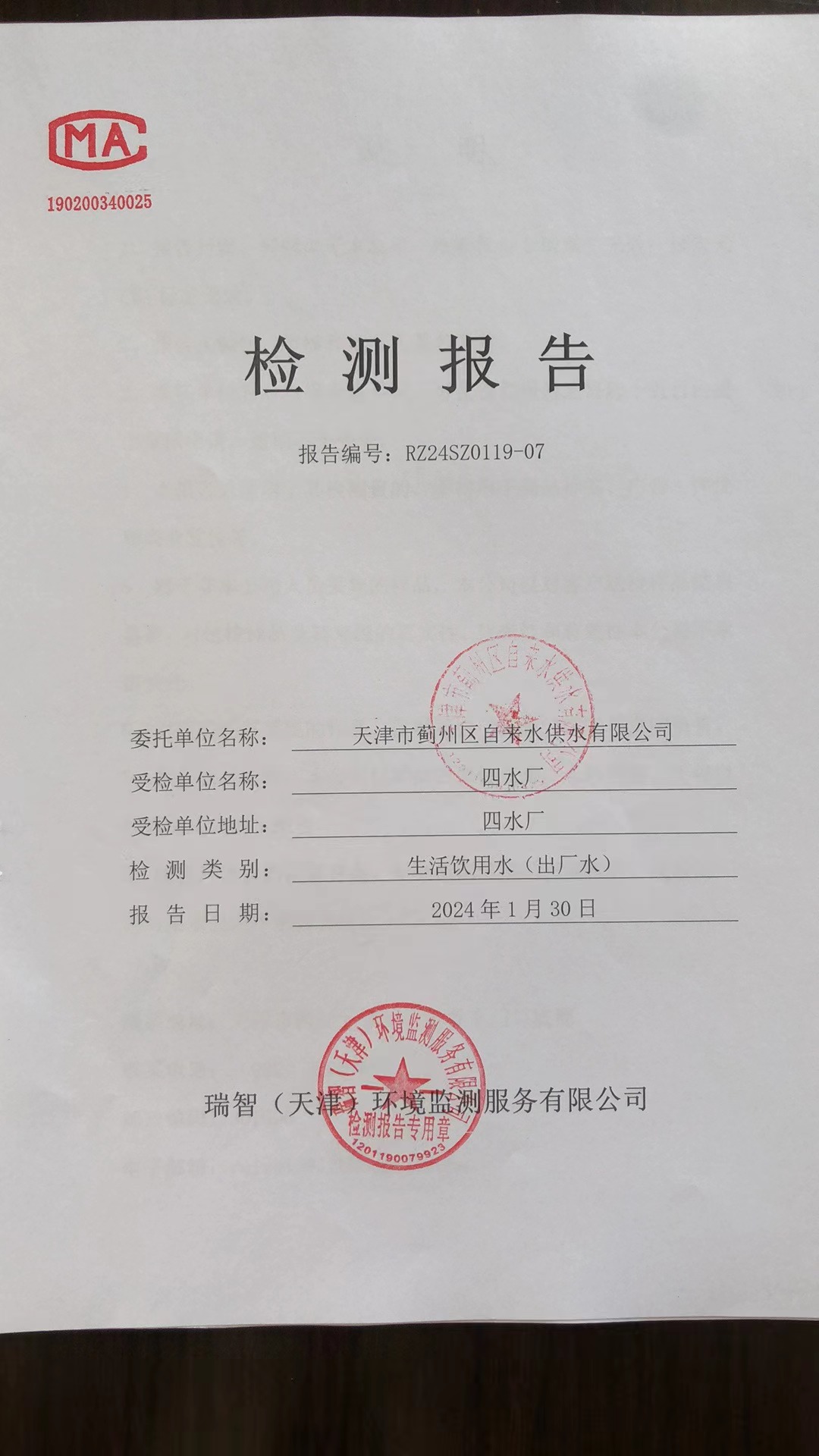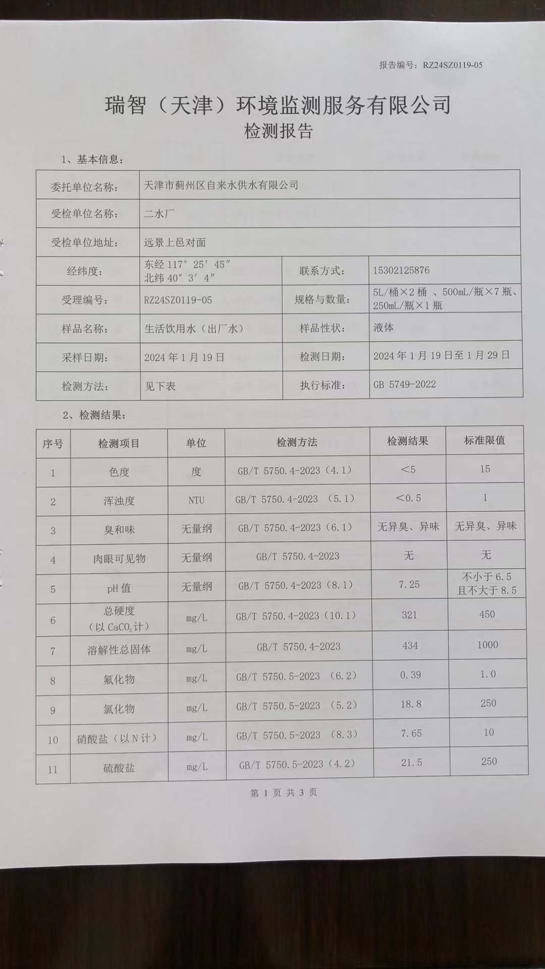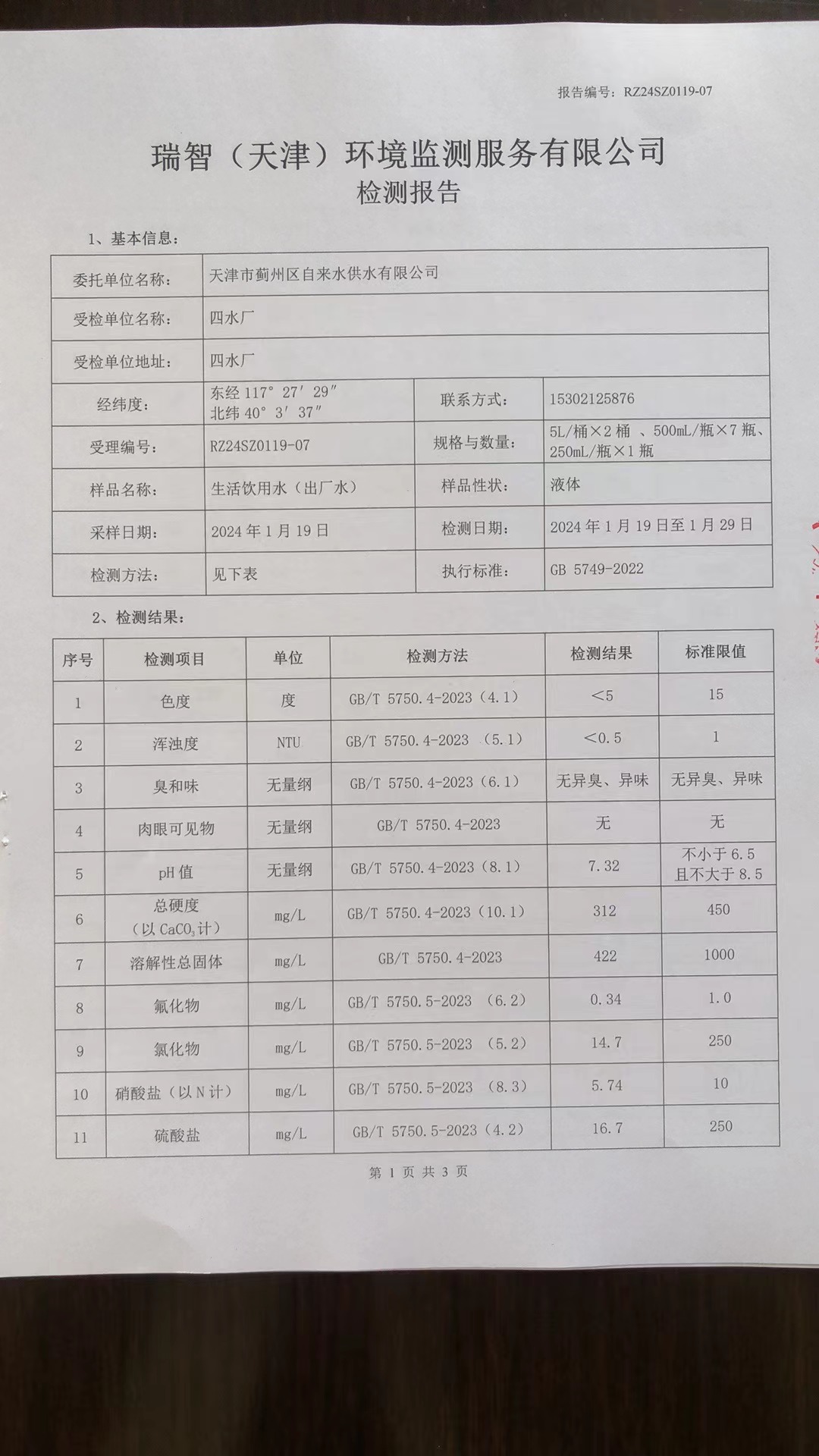 2024年1月份水質(zhì)檢測報(bào)告