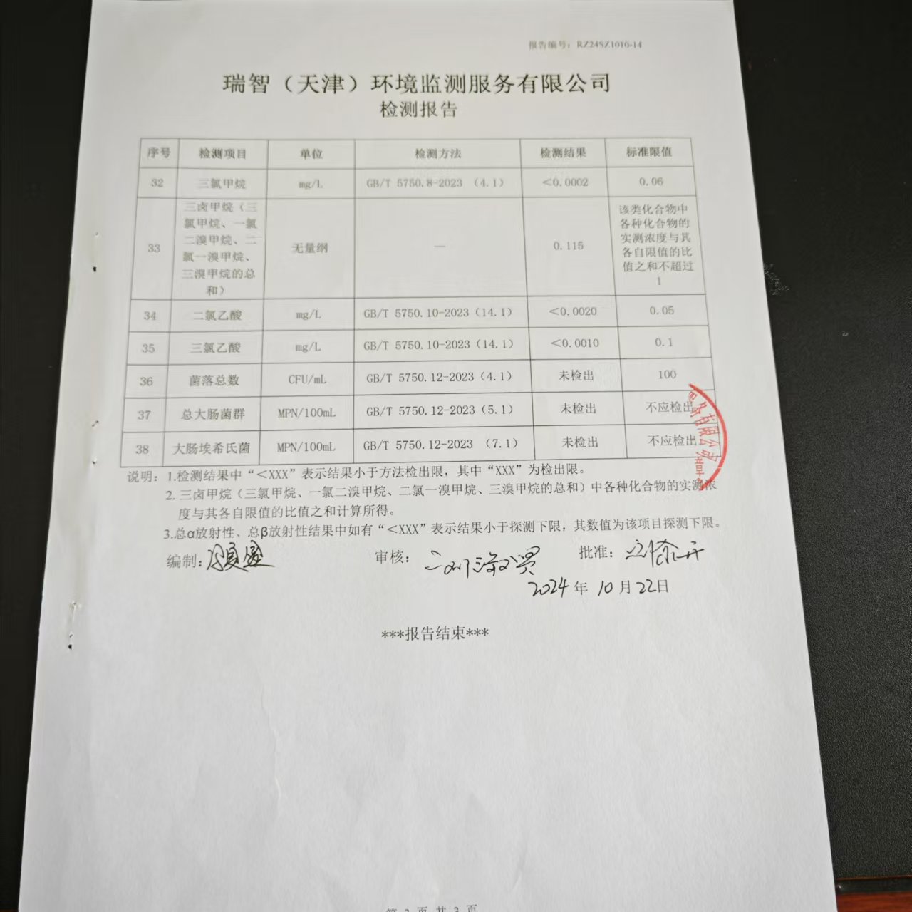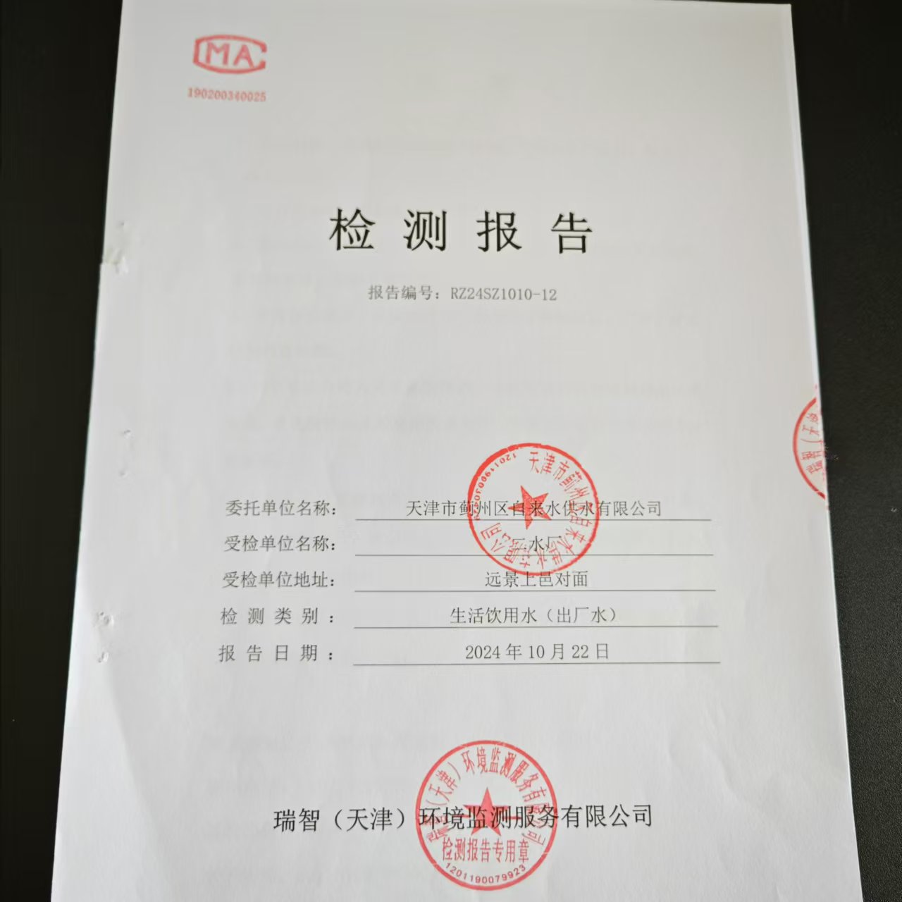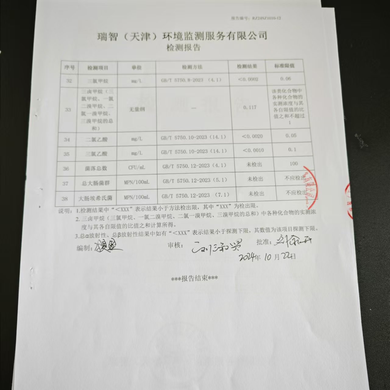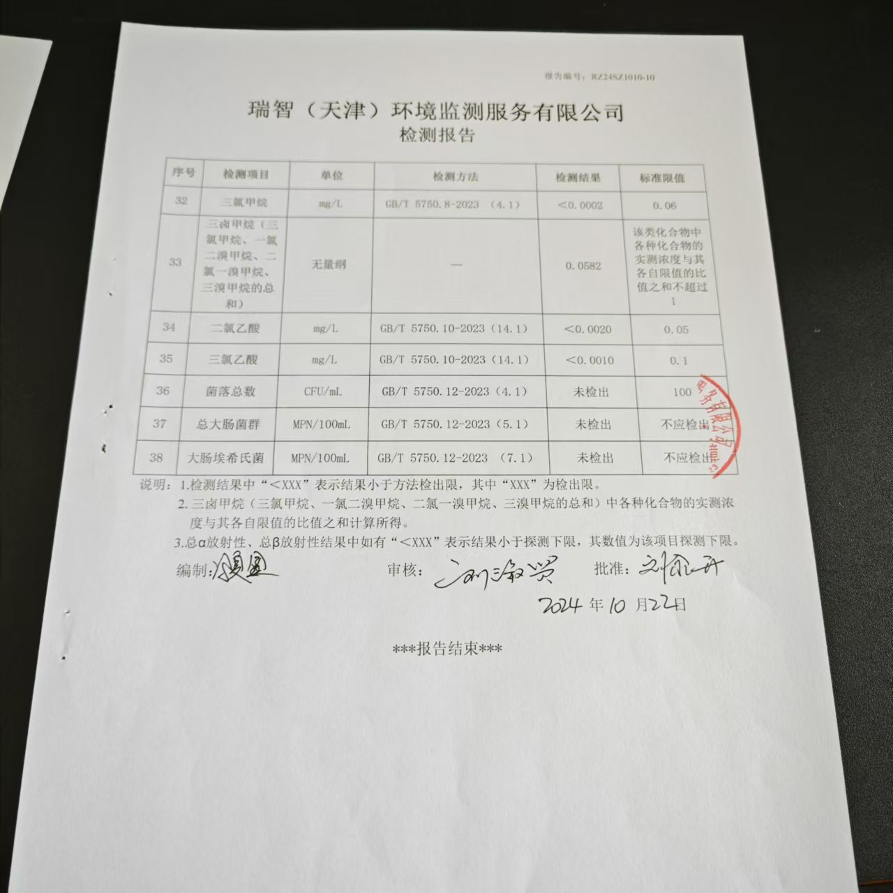 2024年10月份水質(zhì)檢測報(bào)告